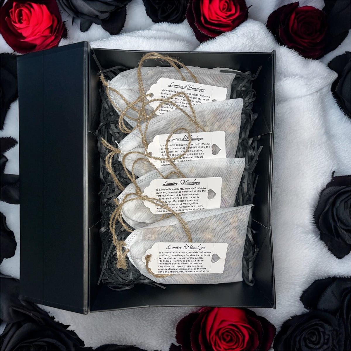 Ce bain de thé contient de la camomille apaisante pour calmer la peau, du sel de l'Himalaya pour détoxifier le corps, un mélange de sept fleurs pour l'harmonie, et du thé vert riche en antioxydants pour revitaliser votre esprit et votre corps.
